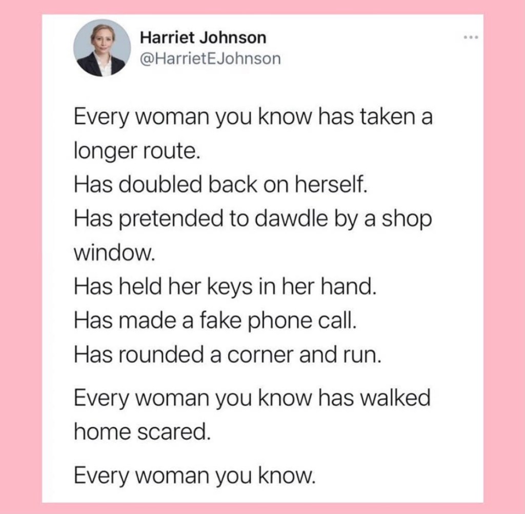 It didn’t surprise me, didn’t give me any reason to pause and wonder about the accuracy in the statements. I just knew that all of it made sense to me and the life I’ve lived and the shoes I’ve walked in. I don’t know a single woman that never moved more quickly or glanced more frequently to preserve her own safety. And if I do, forgive me for the assumption, and I will gladly revise my statement to say: I hardly know any women that this post doesn’t apply to.